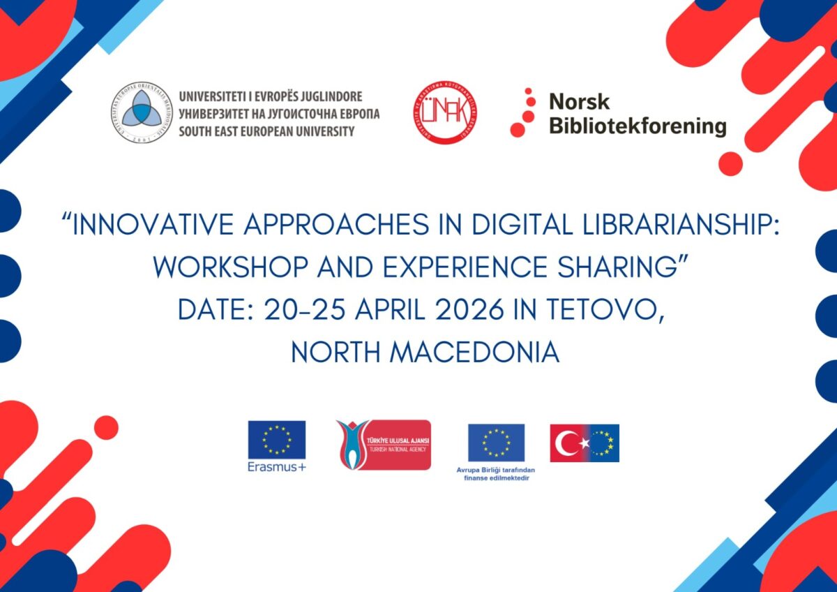 Üniversite ve Araştırma Kütüphanecileri Derneği (ÜNAK) koordinasyonunda yürütülen Erasmus+ (KA210-VET) projesi South East European University ev sahipliğinde 20–25 Nisan 2026 tarihlrinde Tetovo, Kuzey Makedonya’da düzenlenen “Dijital Kütüphanecilikte Yenilikçi Yaklaşımlar: Çalıştay ve Tecrübe Paylaşımı”, etkinliği farklı ülkelerden bilgi profesyonellerini bir araya getiriyor.