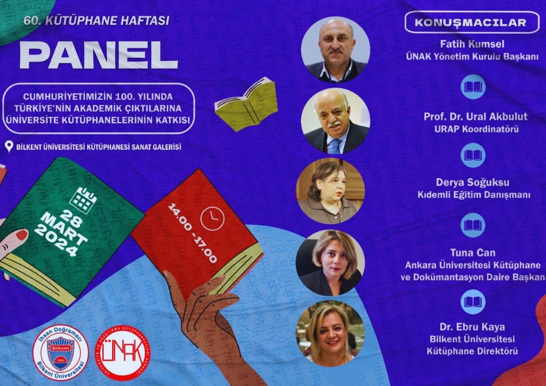 25-31 Mart 2024 tarihleri arasında kutlanacak olan 60. Kütüphane Haftası’ nda Bilkent Üniversitesi Kütüphanesi ev sahipliğinde ve ÜNAK iş birliği ile 28 Mart 2024 Perşembe günü 14.00-17.00 saatleri arasında Bilkent Üniversitesi Kütüphanesi Sanat Galerisi’nde bir panel programı düzenlenmiştir.