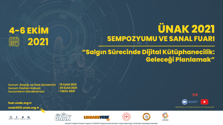 ÜNAK2021 Sempozyumunda, “Salgın Sürecinde Dijital Kütüphanecilik: Geleceği Planlamak” temasıyla Akademik yayıncılık, Açık Bilim konusunda farkındalık yaratmak ve konunun tüm paydaşların ortak katılımı ile tartışılması hedeflenmiştir.